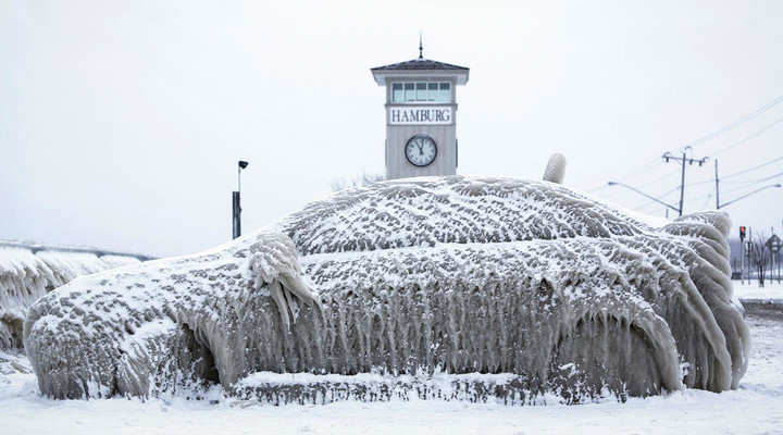 【不要在湖边停车】1月12日,美国五大湖的伊利湖旁,一辆三菱轿车停在了纽约市汉堡区,经过一晚上风吹雪打,第二天就变成了一辆冰车。