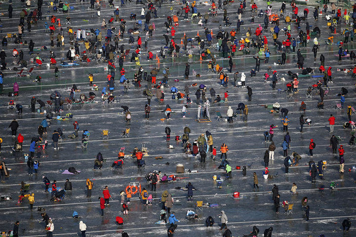 【不要在边界滑冰】但是可以钓鱼,图中是1月9日位于朝韩两国之间的国界河,中间早就树立了界线,但是的大家还是兴高采烈的开始在河中间凿冰钓鱼了。