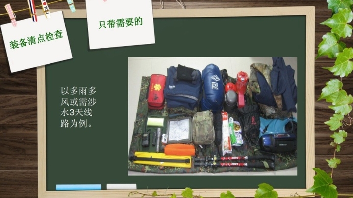 4、尽量携带可以一物多用的物品。每次回来后想想什么东西这次一次也没有用、那么下次就可以不带了(除了必备的求生物品如刀、绳子、哨子、雨衣 紧急的备份干粮和一点饮用水)。