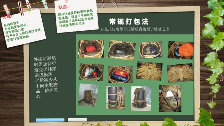 5、尽量不要外挂。帐篷可以拆开,把帐杆插到包里,把内外帐折叠后放在包里,防潮垫如果不是气垫的话可以捆到包的侧面,尽量不要放在包顶上或者下部,在比较茂密的丛林里行走会很费事。