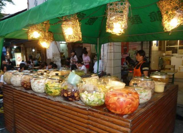 当地人把木瓜、菠萝、萝卜、苹果、李子、莲藕、芹菜等等你想得到的和想不到的蔬菜瓜果洗净切块放入罐子,用醋、辣椒、白糖等腌制一下,吃起来酸、甜、咸、香、脆、鲜,到了南宁不能不吃的就是这酸野,有句话叫做“行人难过酸野摊”。