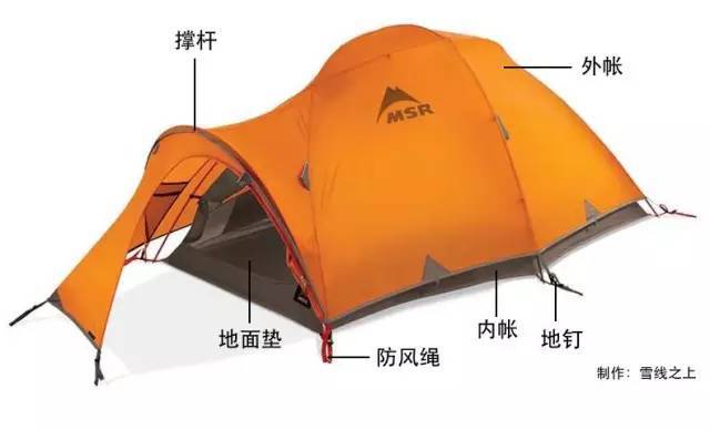 通常,户外帐篷分别由内帐、外帐、撑杆、防风绳等组成,以MSR复仇者(MSR Fury)超轻双层双人高山帐、四季帐为例,分解结构图如下: