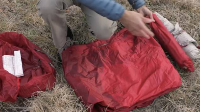 打包帐篷——将内外帐与地面垫往中间折叠,宽度约于肩膀同宽,然后将其卷起打包放入袋内。