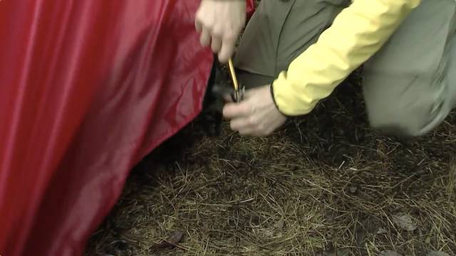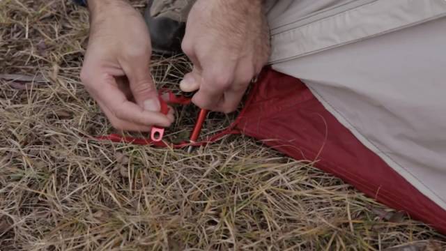 固定地钉——用地钉钩住四角的环插进土里,让帐底伸展开,使内帐处于紧绷绷状态。