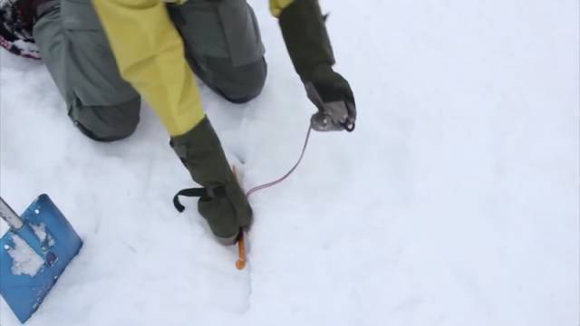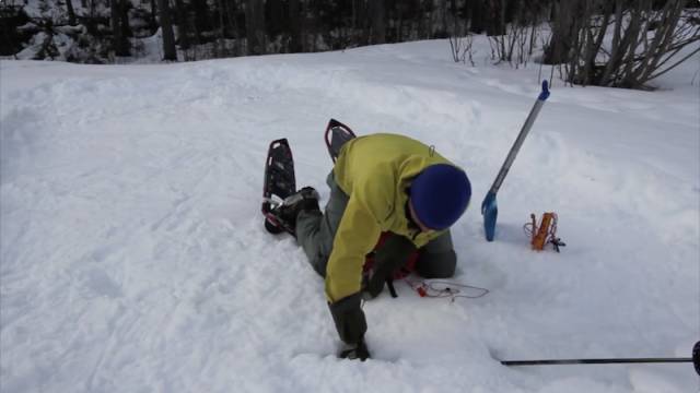 图中的山友用滑雪板将雪弄平整。图片来源:YouTube上发布的《Using Hilleberg tents in the snow》视频截图