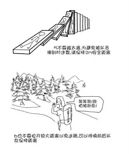 5:行进队形:不要跟太紧,为避免队员滑到时被连累,请保持2-4米安全距离