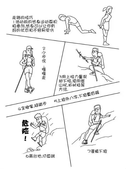 7:谨慎下坡,用好登山杖、护膝或手抓树枝、坚固着力点减轻膝盖冲力。