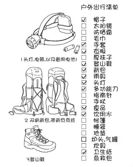 头灯、备用干粮及备用水(500ml)又是户外的一个好习惯哦。而且记住这背包不能离开自己。