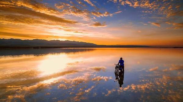 与其它盐湖不同的是,茶卡盐湖是固液并存的卤水湖,湖面具有很强的反射能力,就像是一面为天空准备的镜子。