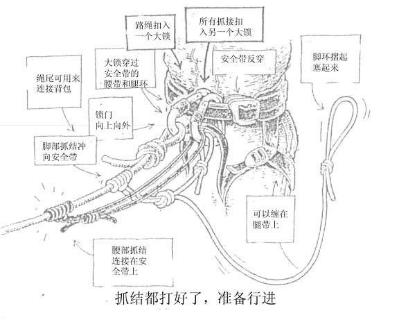 mh:结组系绳看似简单,但要做到即安全又方便还是不容易的.说来话长。以后有机会再谈这一点。队员之间绳子不要留有很多松弛,不要拖到地面。