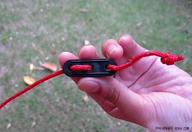 另外再提一点:扎地钉时,打内帐时要先把它拉拉平。下面上个帐绳上三孔滑片的使用方法。