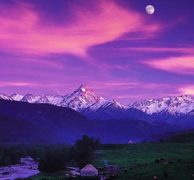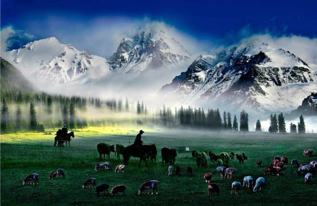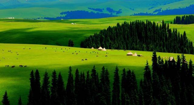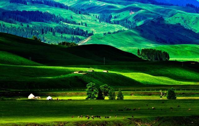 夏草如茵,漫漫的铺满到视线的尽头,舒缓的线条绵绵不绝得的与雪山相连,哈萨克的毡房犹如草原上滋生的白色蘑菇,成群的牛羊悠然自得“咩咩”散步。这是一幅多么美仑美幻的高山草原图画。