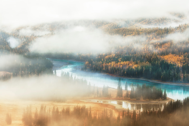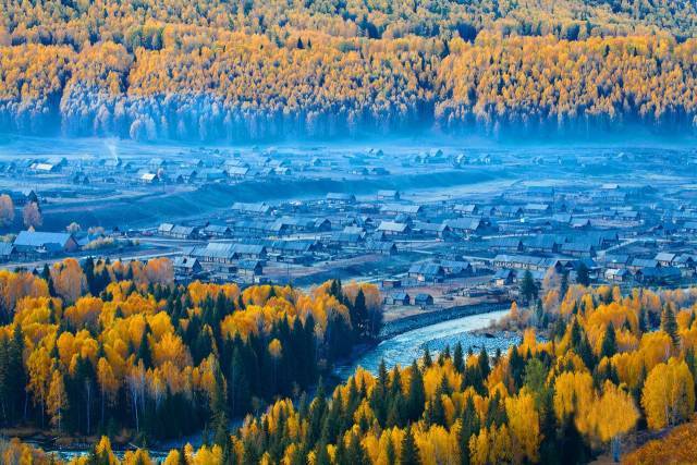 在禾木村子周围的小山坡上可以俯视禾木村以及禾木河的全景:空谷幽灵、小桥流水、牧马人在从林间扬尘而过……跟随游侠客,在清晨登上禾木村旁边山上的观景台拍摄禾木村的晨雾,大多数禾木的全景图均在此拍摄。