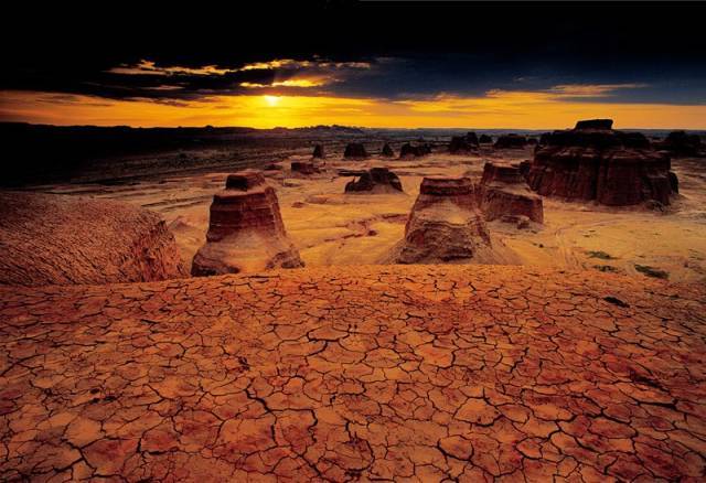 乌尔禾魔鬼城又称乌尔禾风城,是一处独特的风蚀地貌,形状怪异。远眺风城,就像中世纪欧洲的一座大城堡。大大小小的城堡林立,高高低低参差错落。千百万年来,由于风雨剥蚀,地面形成深浅不一的沟壑,裸露的石层被狂风雕琢得奇形怪状:有的呲牙咧嘴,状如怪兽;有的危台高耸,垛蝶分明,形似古堡;这里似亭台楼阁,檐顶宛然;那里象宏伟宫殿,傲然挺立。真是千姿百态,令人浮想联翩。