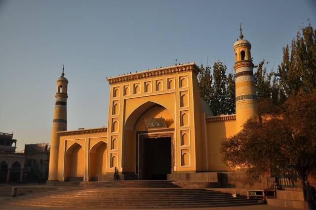 艾提尕尔,意为节日礼拜场所,位于喀什市中心解放路,是新疆最大的清真寺,也是全疆伊斯兰教的活动中心。它始建于1442年,后另经重修扩建,才有今天规模。大寺规制严整雄伟,砖砌方形拱寿门的大门楼高达12米,边廓环以15个穹形壁窿形楼。分为“正殿”、“外殿”、“教经堂”、“院落”、“拱拜孜”、“宣礼塔”、“大门”等七部分。大寺正门楼以浅绿色为主色,布满精细刻花;宏大的礼拜寺和教经堂,极富伊斯兰特色。