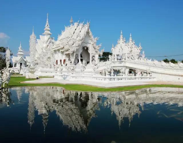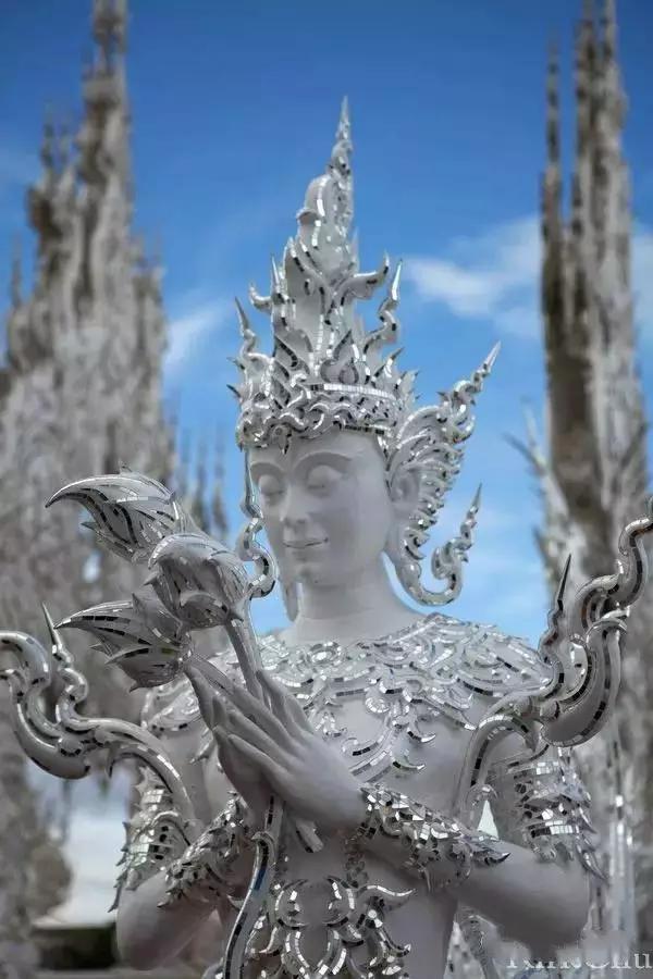 这栋充满现代化风格的寺庙堂外装饰着镜子的碎片,寓意着佛的智慧照耀着全宇宙;而整个庭院都是圣洁的白色,象征着佛陀的纯洁。