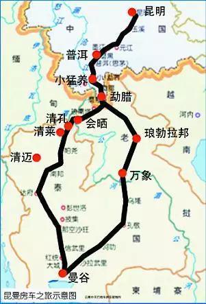 昆曼公路起于昆明,途经玉溪、普洱、西双版纳进入老挝境内南塔、波乔省,经会晒进入泰国清孔 ,在泰国境内经清莱、南邦、来兴(达府)、那空沙旺、猜那府最后抵达首都曼谷。全程行车里程1880公里,全部路段均设计为高速(高等级)公路,并连接马来西亚、新加坡公路网,被亚洲开发银行称为“亚洲公路网中最激动人心的一个路段”
