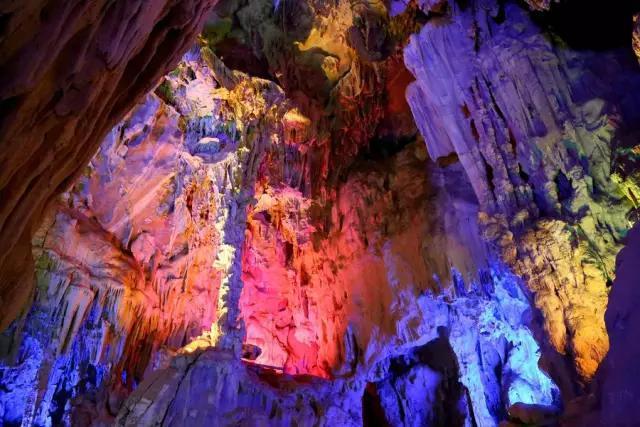 泛舟于洞内,河水清莹如玉,清泉叮咚作响,水里的锦鲤优雅的舞动着尾巴,头顶的石钟乳奇形怪状。