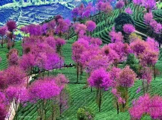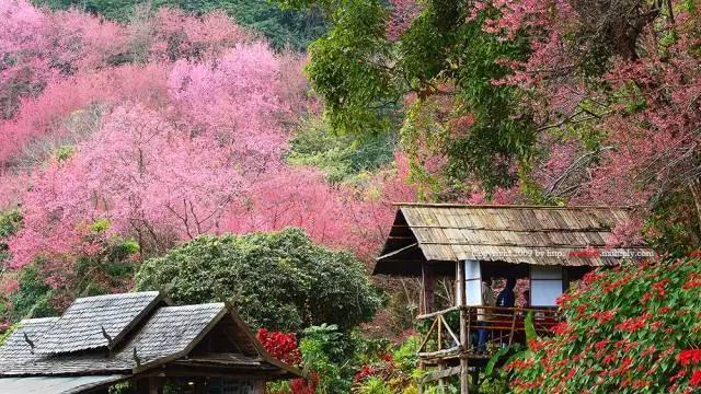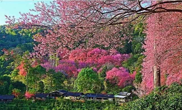 坤昌莫被泰国人称为樱花谷,是泰国赏樱的绝佳地点,这里的樱花如云似霞,粉嫩甜美,就像粉面含春的佳人,引得无数游人为之驻足。