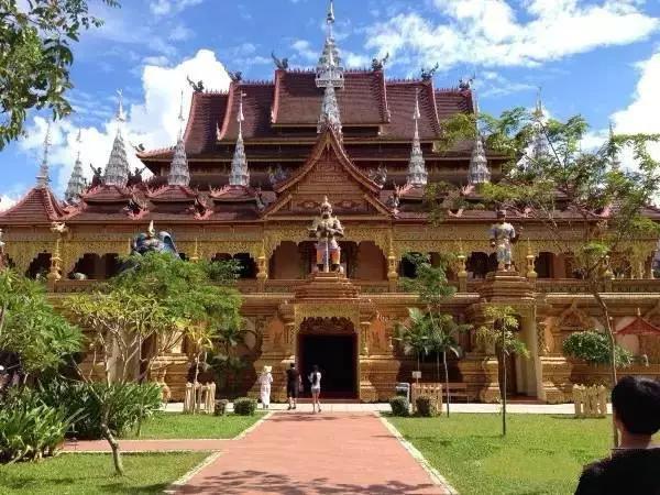 这个金碧辉煌的寺庙是西双版纳佛寺中等级最高的佛寺,琉璃幻彩的尖顶和周围茂盛的森林植被相映成辉。