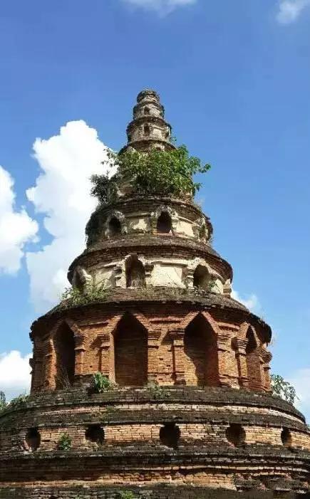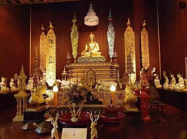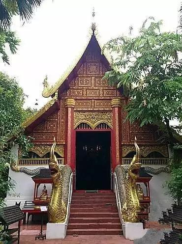这个有金色和红色相间的镶板的寺庙是典型的兰那式僧院,寺庙后面有座圆锥型的7层塔。
