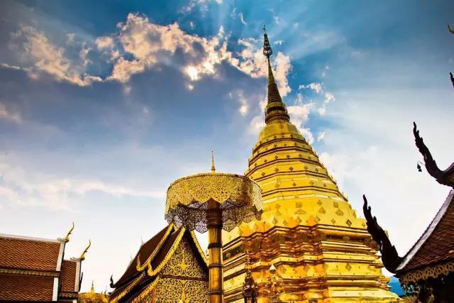 金光闪耀的双龙寺在清新朴实的清迈房屋中间显得异常突出,它是泰国著名的佛教避暑胜地。