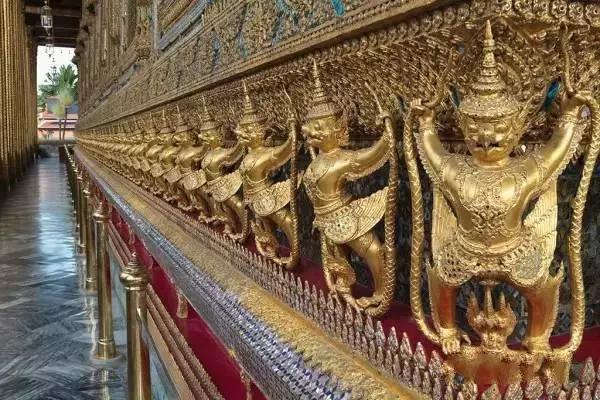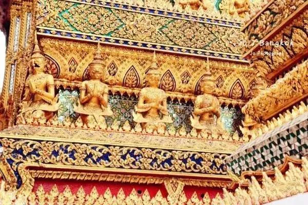 雄伟宏大的大皇宫金碧辉煌,汇聚了泰国建筑、绘画、雕刻和装潢艺术的精粹,具有鲜明的暹罗建筑艺术特点。
