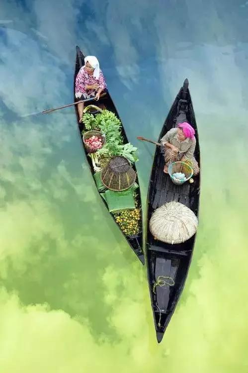这里是不可多见的水上集市,摊贩们划着小木船在窄小的河上慢慢行驶着,交错往来。