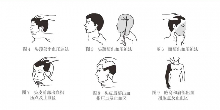 1) 头顶出血压迫法:方法是在伤侧耳前,对准下额关节上方,用拇指压迫颈动脉(图4)。
