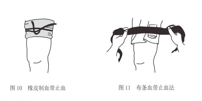 适用于四肢的动脉出血,是快速、彻底的最有效止血方法,没有止血带时可用橡皮止血带(图10)或者布条(图11)代替。
