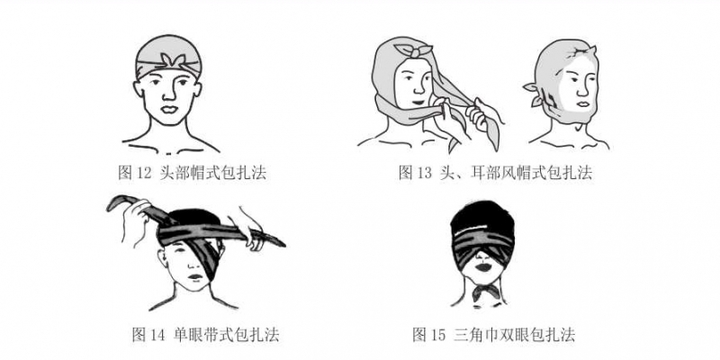 1) 头部帽式包扎法:将三角巾的底边向内折叠约两指宽,放在前额眉上,顶角向后拉盖头顶,将两底边沿两耳上方往后干拉至颈部下方,左右交叉压住顶角绕至前额打结固定(图12)。