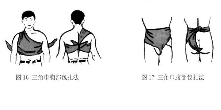 4)三角巾胸部包扎法:将三角巾的顶角置于伤侧肩上,两底边在胸前横拉至背部打结固定,后再与顶角打结固定(图16)。