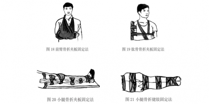 a、前臂骨折的固定方法:用夹板时,可把两块夹板分别置放在前臂的掌侧和背侧,可在伤员患侧掌心放一团棉花,让伤员握住掌侧夹板的一端,使腕关节稍向背屈,然后固定,再用三角巾将前臂悬挂于胸前。无夹板时,可将伤侧前臂屈曲,手端略高,用三角巾悬挂于胸前,再用一条三角巾将伤臂固定于胸前(图18)。