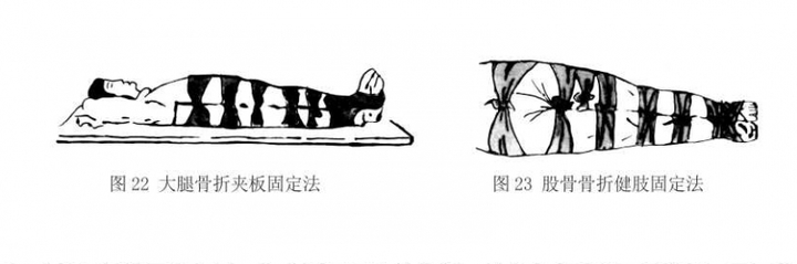 d、大腿骨折的固定方法:将夹板置于伤肢外侧,其长度应从腋下至脚跟,两下肢并列对齐,垫好膝、踝关节后用绷带分段固定用。(图22)