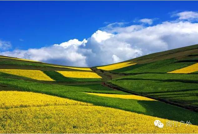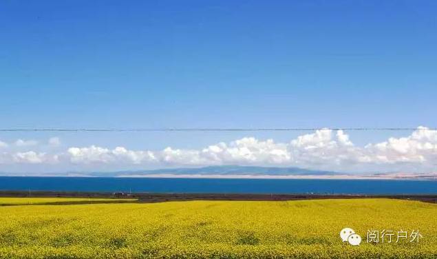 青海湖的油菜花则是几公里绵延不绝,犹如黄色的花毯、仿佛黄色缎带,还有些则散落着,像绿色海洋里的繁星......
