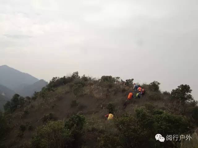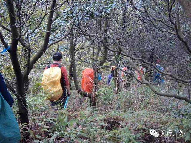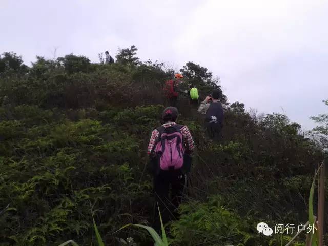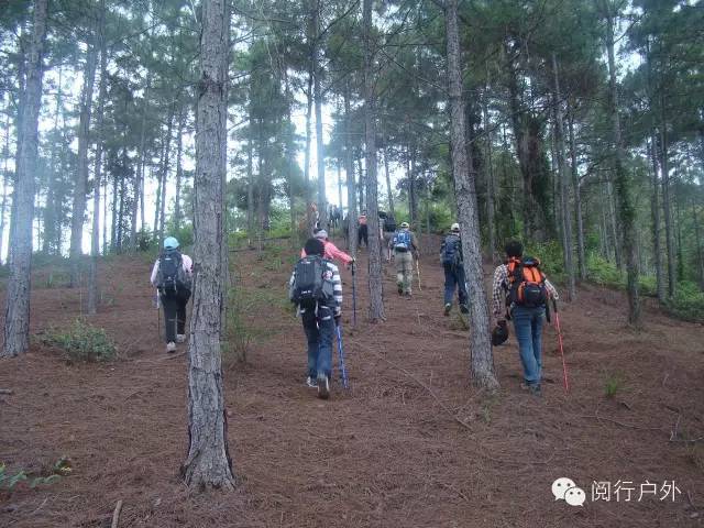我没有多少兴奋,或许是老新人的缘故,几个年轻小伙倒是压制不住内心的兴奋,全力向山林奔去,投入山林的怀抱。山之幽静,林之茂密,清香没有铜臭,绿油洗刷尘俗。身在山林,我心宁静。登山的开始就是一段急升,跟着年轻力壮小伙们前行,作为小组长的海浪瞻前顾后,关注着队员的行进状况,看到如茵拖在后队,呼声着前队等待队友。两度呼喊,两度等候,如茵甚觉难受,队友伸出援手,分担如茵的行装。如茵担心拖累队友,最终还是选择了下撤。(后觉得急升来得太快,应慢慢适应,队员过于兴奋,没有掌握节奏,拖垮了如茵。)终于,走完了急升段,全队休整补水,回望走过的路,有一丝的成就,俯看山下,风光尽收眼底,几部单反也咔嚓着,记录那片片山体绿意。