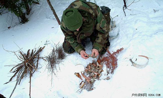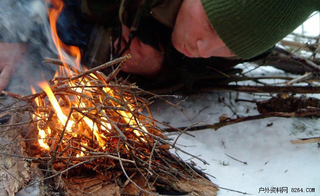 现在你可以生火了。选一个尽可能背风的位置,比如挨着大石头或者是山根儿底下。用你的防水火柴, FireKnife,镁棒或者是Jetboil炉来生火。当温度低于冰点的时候,打火机绝对指望不上。这也正体现出了防水火柴的伟大。