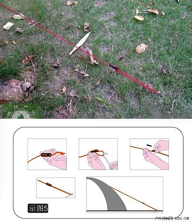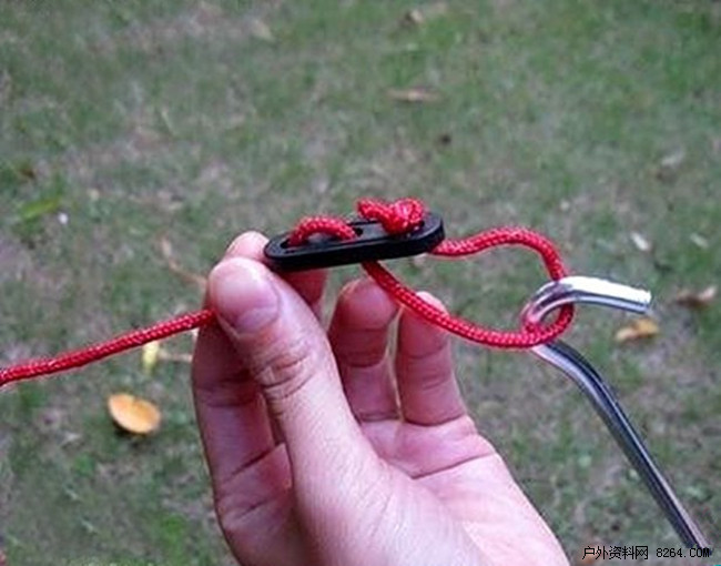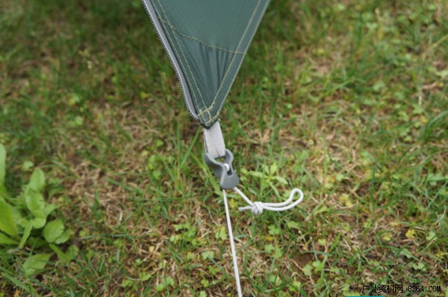 另外再提一点:扎地钉时,打内帐时要先把它拉拉平。下面上个帐绳上三孔滑片的使用方法。