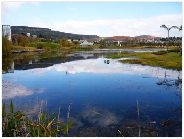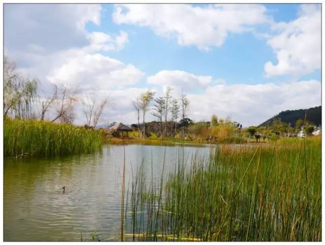 简单安顿好以后,这就迫不及待去赴抚仙湖的“秘密约会”了。我住的酒店内有一座玻璃钢结构的“时光长廊”穿过环湖公路,从地下直通湖边的月亮湾湿地公园。这座湿地公园打造得很不错,相当值得一游。湿地水体与疏林长草相掩映,完全就是“蒹葭苍苍、白露为霜”的诗意情致。除了芳草萋萋,还有黄花满地洒金,紫色勿忘我亭亭玉立,把这本应萧条的冬日也点缀得鲜活明媚。