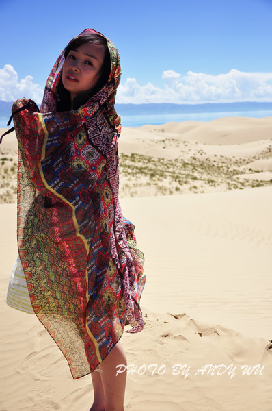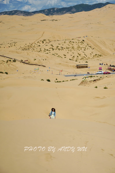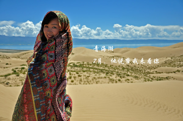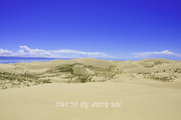 站上沙丘的顶端,青海湖就在远处和蓝天混为一体,恍惚中,有种丝绸之路的错觉!