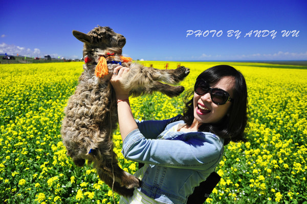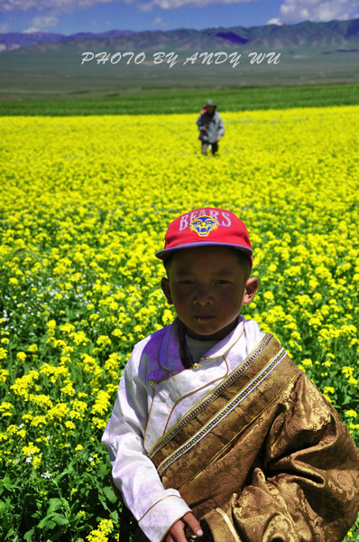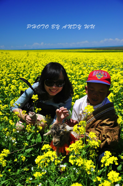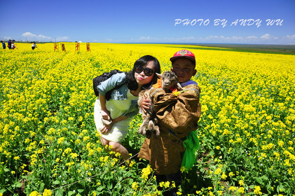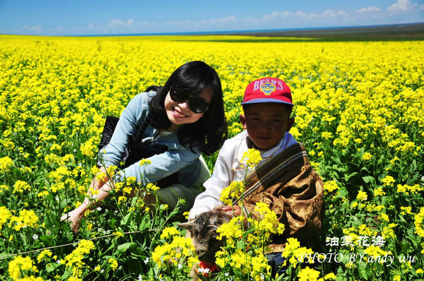 过了倒淌河,沿途藏民的圈地运动就开始了!但凡有油菜花的地方,就有藏民圈地收钱,要想和油菜花亲密接触,5元/位,骑马,骑牦牛,抱小羊的价格另算。下车我就发现这个抱小羊的藏族小男孩,
