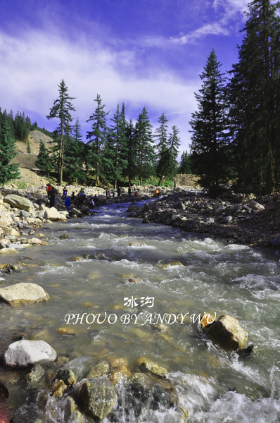 沿盘山公路下山,沿途还能看到站在悬崖边上的羊群,还有偶尔的积雪。当你有些厌倦一天以来都是满眼绿色草坡的景致时,冰沟就适时地闯入你的视线。成片的树林,中间夹杂着一条从雪山上流下来的流水,配合得相得益彰!