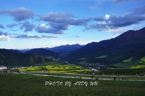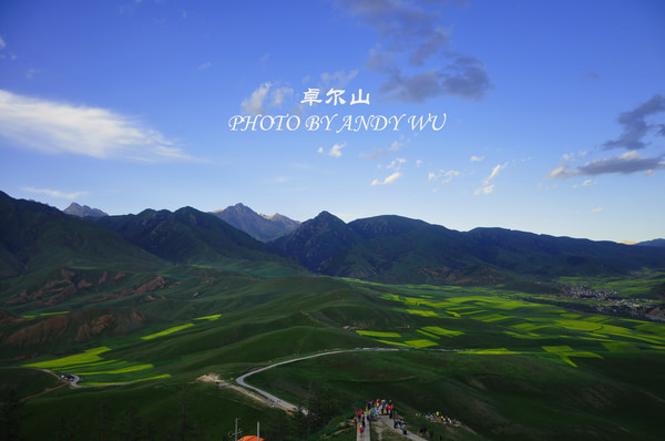 卓尔山上,一边是油菜花、青稞铺满地的田园风光,牛心山像个守护者一样高高矗立,另外一边丹霞地貌,远处是祁连县城。找一块草地坐下,和红色的土地、黄色的油菜花、绿色的青稞、白色的如意塔一起守候落日的来临。