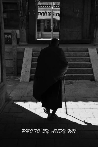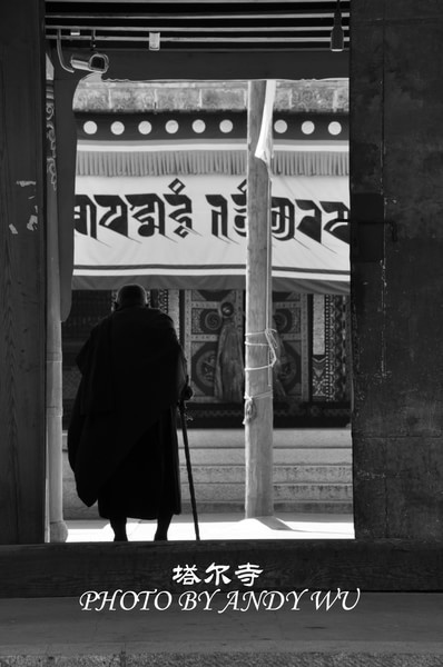 在出塔尔寺的时候,最让我感动的一幕出现了,迎面而来的一位老喇嘛,拄着拐杖,和周围行色匆匆的游人形成鲜明的对比,他缓缓的前行,和我错身而过,慢慢跨过坐满游人的门槛,我慌忙叫住吴先生,快点!快点!黑白,背影!看着他,真的就像时间就此停住的感觉!我们因为工作、家庭、目标、人生,总是匆匆,你都忘了你真正要的是什么,总是在追赶,到最后当你得到的时候还是很失落,而今天,看着老喇嘛的背影,释然!平淡!