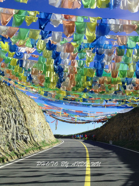 旺季路上车多,日月山我们就遥遥相望了,没准备上!中午时分到达倒淌河,倒淌河门票25元,我们也没进,其实在公路上透过经幡就能看到它的模样,进去的价值不高,在外面观赏的游人较多。