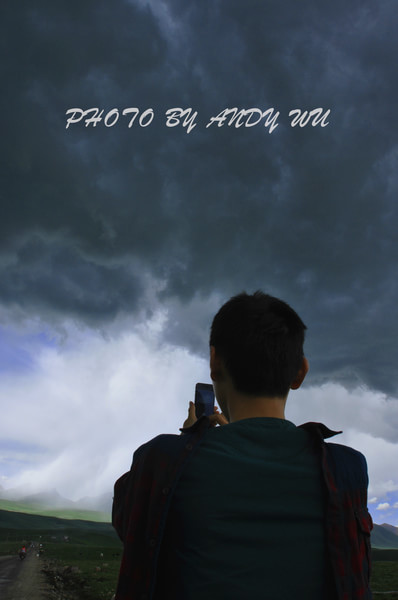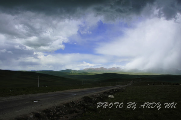 刚察吃过午饭,后面的乌云就追过来了,出刚察后,前面平整的公路就变成坑坑洼洼的土路,车速自然是跑不起来,乌云从身后到我们头顶,画面有点像大片里面龙卷风来袭,前方的乌云和地面连成一片,赶到牛粪堆的时候,雷声、雨点就接踵而来!