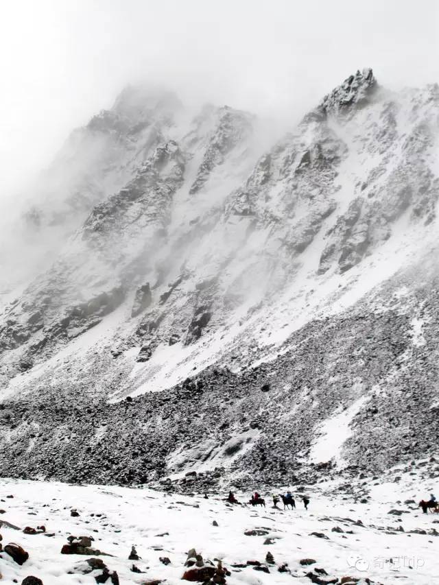 进山的峡谷走到尽头,道路折向北进入拉曲峡谷,路开始缓慢上升。脚步也开始有些沉重,正气喘吁吁,寒意随风骤起,一大片浓黑的云雾,势不可挡地远远压了过来。还没等翻起防水外套的帽子,冰凉的雪花已经落在脸上。真的又下雪了,而我们还有至少十公里漫长的路。