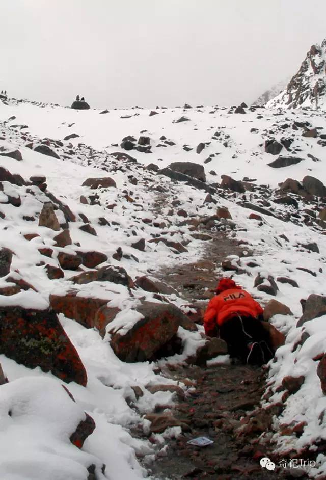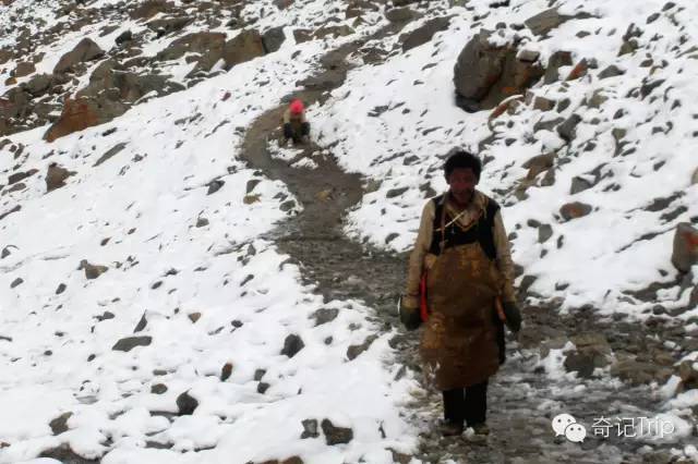 而所谓路,就是朝圣者们用身体用脚步,在积雪和乱石中融化出的一道雪沟。只见以藏人、印度人为主的转山者,正俯着身子,牦牛般“之”字形在陡坡上,缓慢向上移动。通向卓玛拉山口的苦旅终于开始了。
