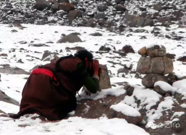 当我几乎抬不起灌铅的脚步,他们却是这样一路磕长头上来的。额头凸着厚茧,面庞满是尘土,手套两块木板,叩拜在崎岖山路。当我差点因为山高路陡、冰霜雪雨而放弃,却没有什么能够阻挡他们的朝圣热情——用自己的躯体,用自己的信仰,讴歌朝拜脚下这片神圣的土地。在大自然的博大面前,生命如此脆弱,却又如此丰盛与顽强。无论一个人信仰什么,都不能不为这虔诚的执着所震动。