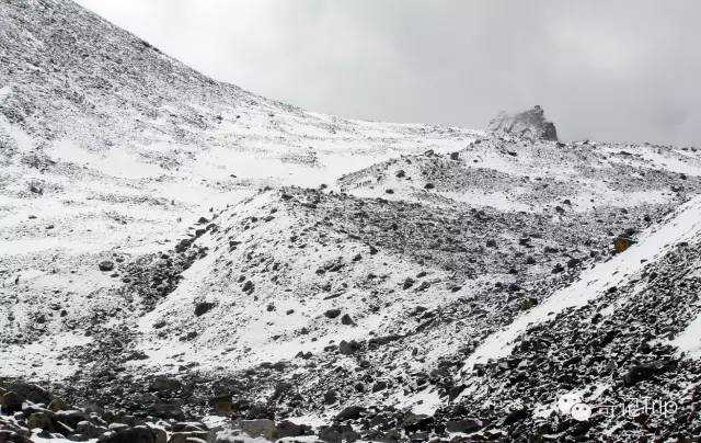 跨过卓玛拉山口,便是一路下山。风景大变,不再是茫茫雪域,代之以急陡的满山碎石。这超过70度的垂直陡峭,被许多人封为全程最危险地段。没有路,只能在陡峭的乱石夹缝间,跳跃行进。